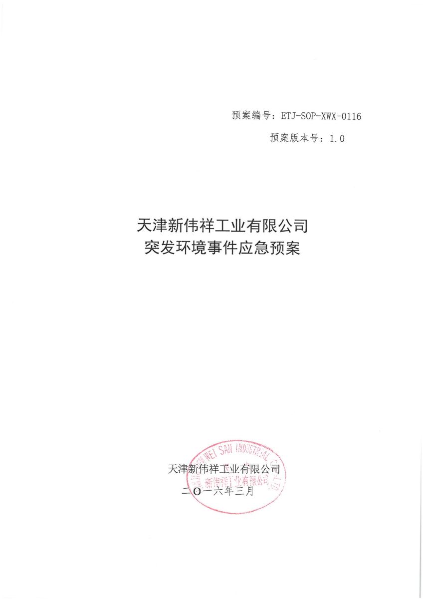 天津新伟祥工业有限公司突发环境事件应急预案